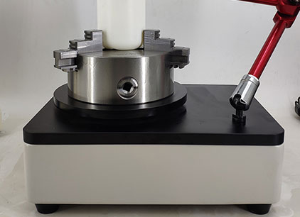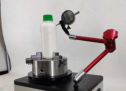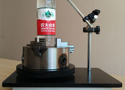 将瓶底加持固定在水平板的旋转盘上,使瓶口与千分表接触,旋转360°读取最大值和最小值,二者之差的1/2即为垂直轴偏差数值。仪器利用四爪自定心卡盘同心度高的特点,配合一套可以自由调节高度和方位的高自由度的支架,可以满足各类玻璃瓶及塑料瓶检测。